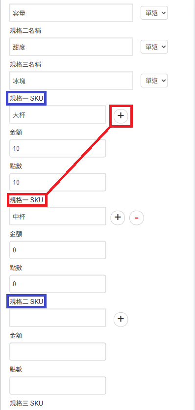 按下右邊 + 號 ,即可再增加一個(規格一SKU)