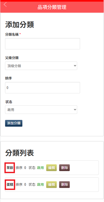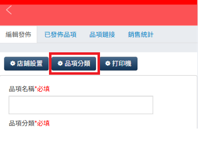 7.餐點如需分類,點擊「品項分類」,設置分類名稱,例如:茶飲類、蛋糕類、、,然後進入「已發布品項」點「修改」按紐,為每個餐品選擇分類。